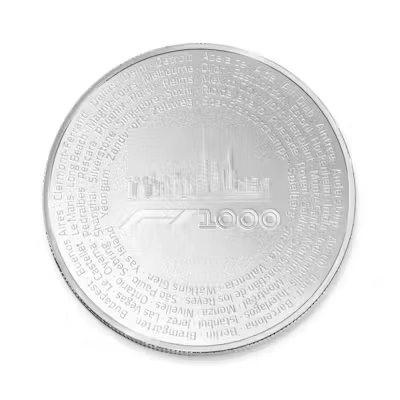 The latest F1 silver coin to be created celebrates all the Grand Prix events in the 2019 season, with the locations shown in calendar sequence around the edge of the coin, and the dramatic F1 logo in the center.