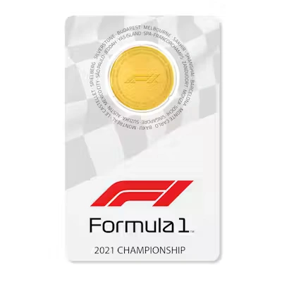 This new, limited edition proof gold coin release celebrates the 2021 Formula 1 Championship. The Grand Prix events in the 2021 schedule, as confirmed 1/1/2021, are listed around the face of the coin, with the dynamic F1 logo in the center.