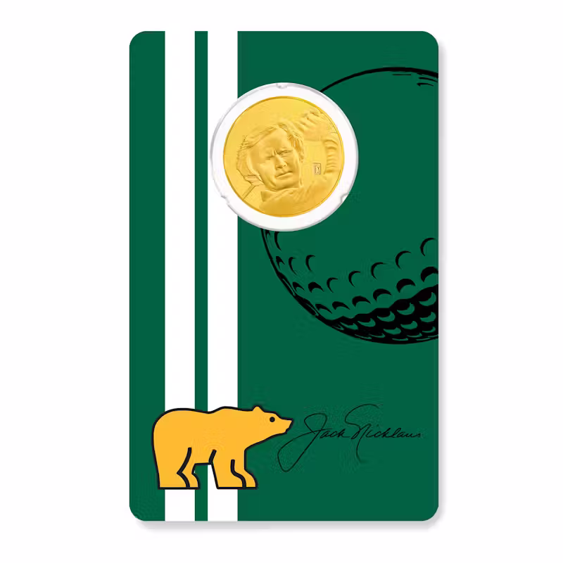 The protective package features the Golden Bear logo and a reproduction of Mr. Nicklaus’s signature, both of which are globally recognized trademarks, and acts as a numbered certificate of authenticity. It also includes a statement of metal fineness, weight, and proof quality, as well as the signature of the accredited assayer at PAMP.