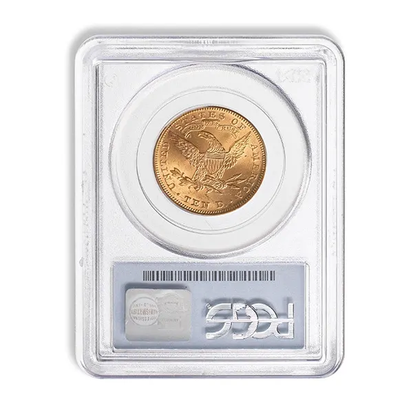 This $10 Liberty Gold Coin is professionally graded with a score between 1-70 on the Sheldon scale. Grading criteria includes sharpness of strike, luster, coloration, surface preservation, and visual appeal, with 70 being a perfect score. After grading, the coin is sealed in an acrylic, tamper-proof “slab” to protect and preserve it indefinitely. Please call for availability and for grading and pricing information.