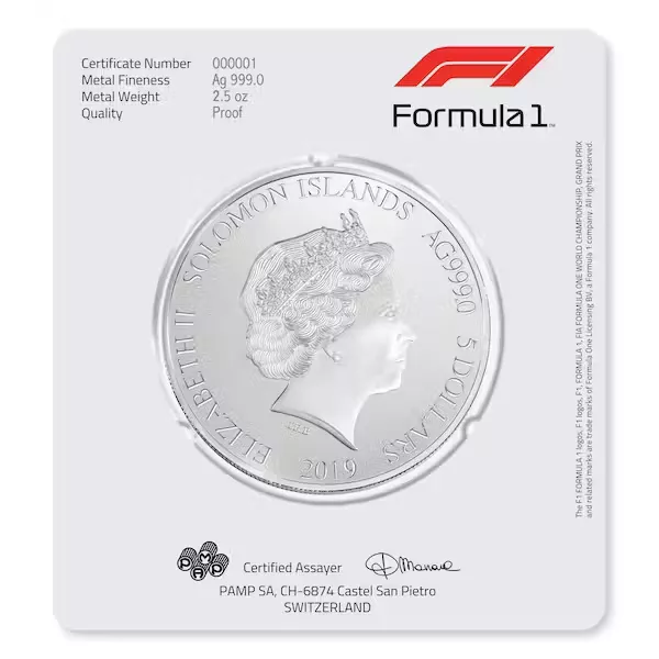 The beautifully-crafted commemorative 2.5 oz silver coins list all the race locations in the 2019 season in calendar order around the official F1 logo, shown in the center of the coin. On the obverse side of the coin is Ian Rank-Broadley’s portrait of Queen Elizabeth II. The packaging includes a Certificate Number, statement of metal fineness, weight, proof quality statement, and the signature of the PAMP assayer.