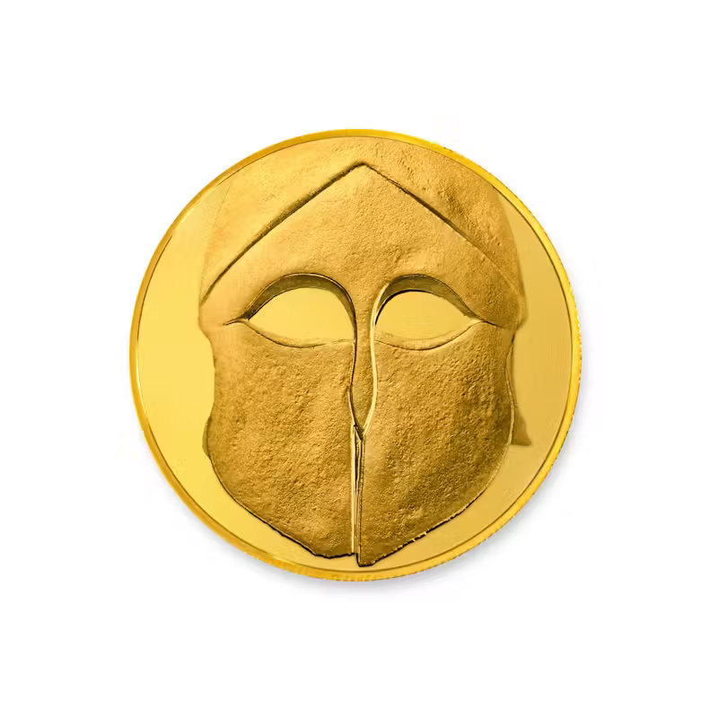 This new coin shows a frontal view of a beautiful, classical Greek helmet of Corinthian type in bronze, dated to around 500BC. The Corinthian helmet originated in ancient Greece and took its name from the city state of Corinth. Such helmets were made of bronze and in later styles, such as this example, covered the entire head and neck, with slits for the eyes and mouth. Out of combat, a Greek hoplite would wear the helmet tipped upward for comfort. This practice gave rise to a series of variant forms in Italy, where the slits were almost closed since the helmet was no longer pulled over the face but worn cap-like.