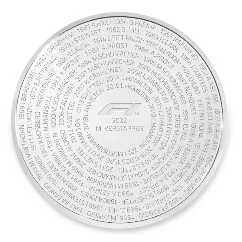 Rosland Capital is proud to offer this astonishing new 1-kilo coin, which lists all the winners of the Formula 1 Drivers Championship, in sequence from 1950 to 2022. This is a wonderful display of the skills of the PAMP mint, and a great item for any collector.