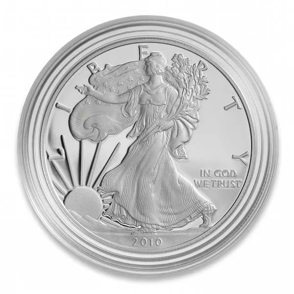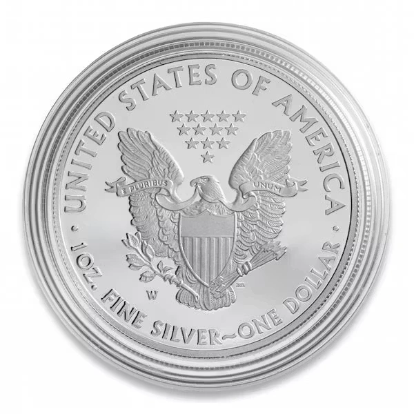 The Proof American Eagle silver coin is a collector version of the popular American Eagle silver bullion coin produced by the United States Mint. There are limited supplies minted each year of these proof coins.