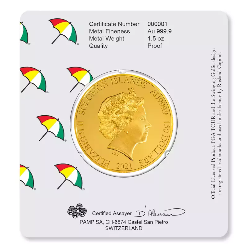 This new 1.5 oz gold portrait captures Mr. Palmer’s warm smile, conveying the pleasure he took in his beloved sport. It also features his famous umbrella logo and the PGA TOUR logo.