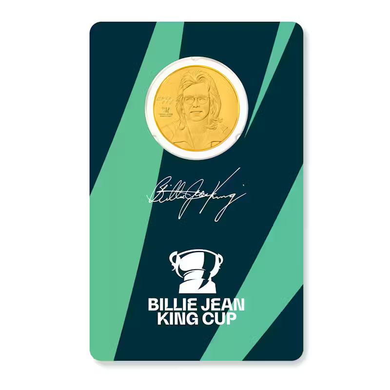 The protective package bears the Billie Jean King Cup logo and Ms. King’s signature, and acts as a numbered certificate of authenticity. It also includes a statement of metal fineness, weight, and proof quality, as well as the signature of the accredited assayer at PAMP.