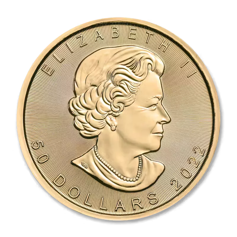 The iconic Maple Leaf is on the reverse of the coin and this national symbol of Canada gives the coin its name. On the back you will also find the purity of the gold on both sides of the leaf, the words “FINE GOLD” and the amount of gold. Also, “CANADA” is arched across the top. The purity of the gold is in both English and French, the national languages of Canada.