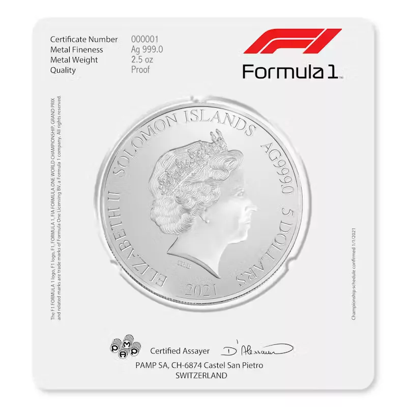 The beautifully-crafted commemorative silver coin lists all the race locations in the 2021 season, as confirmed 1/1/2021, in calendar order around the official F1 logo, shown in the center of the coin. On the obverse side of the coin is Ian Rank-Broadley’s portrait of Queen Elizabeth II. The packaging includes a Certificate Number, statement of metal fineness, weight, proof quality statement, and the signature of the accredited Swiss assayer at PAMP.