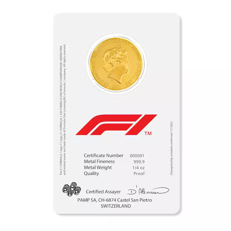 The beautifully-crafted commemorative gold coin lists all the race locations in the 2021 season, as confirmed 1/1/2021, in calendar order around the official F1 logo, shown in the center of the coin. On the obverse side of the coin is Ian Rank-Broadley’s portrait of Queen Elizabeth II. The packaging includes a Certificate Number, statement of metal fineness, weight, proof quality statement, and the signature of the accredited Swiss assayer at PAMP.