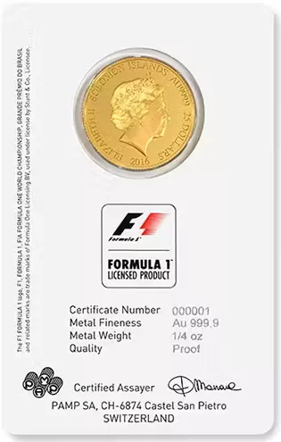 Our beautifully crafted GRANDE PRÊMIO DO BRASIL™ coins feature the official F1 logo, the name of the event, and a Formula 1® 2016 car. On the obverse side of the coin is Ian Rank-Broadley’s portrait of Queen Elizabeth II. The packaging includes a Certificate Number, statement of metal fineness, weight, proof quality statement, and the signature of the PAMP assayer.