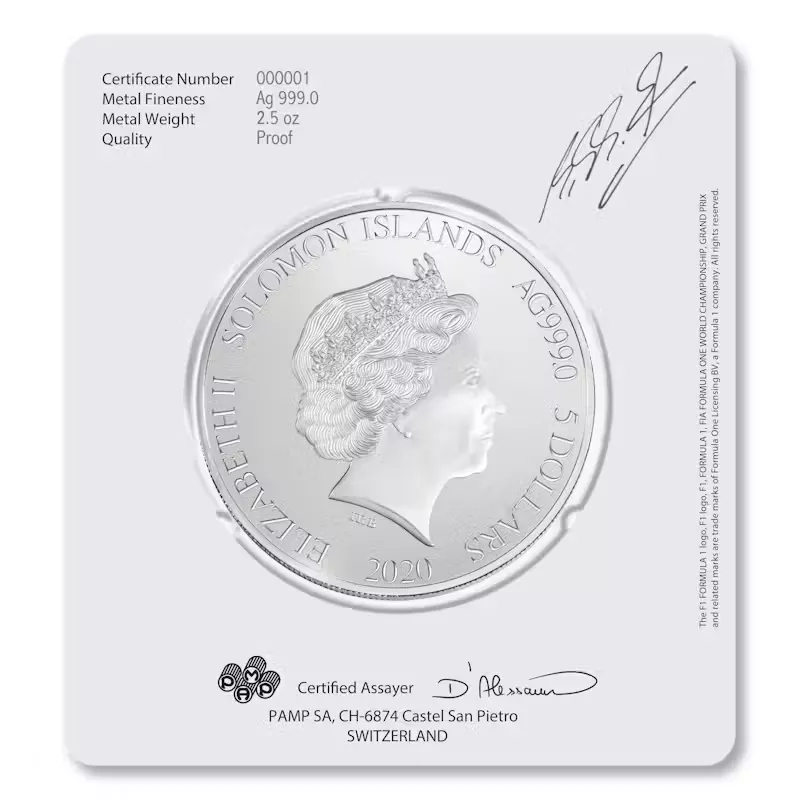 These proof coins are .999 fine silver, 2.5 Troy oz., 2020 issue, legal tender. All the coins in the Michael Schumacher collection are minted by Swiss-based PAMP SA, one of the world’s finest producers of precious metal coins.