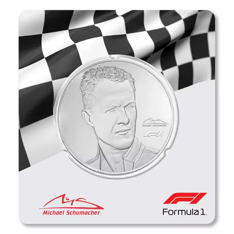 In collaboration with Formula 1 ®, Rosland now proudly presents a 2.5 oz silver proof coin celebrating the achievements of Michael Schumacher, seven-time FIA World Champion. This proof coin features an iconic portrait of the handsome Mr. Schumacher, together with his signature/logo and the dramatic F1 logo.