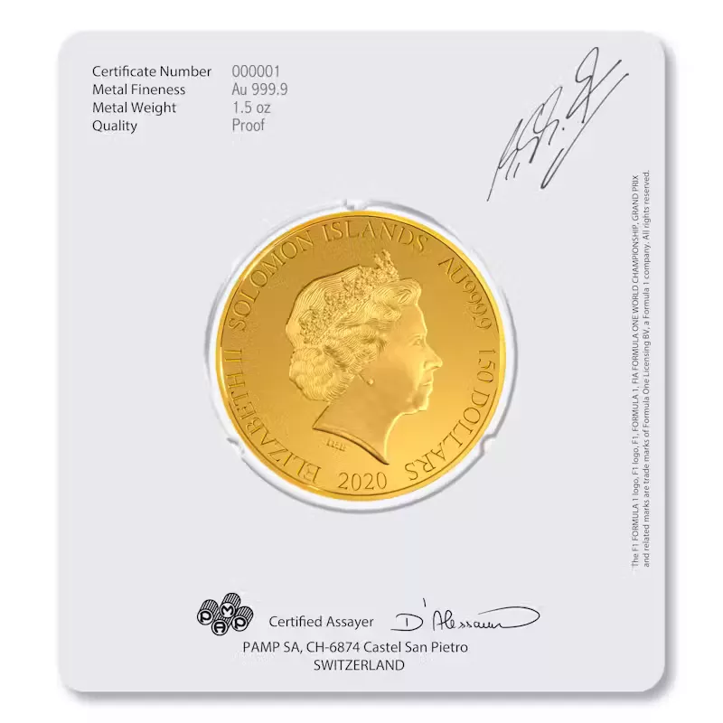 These proof coins are 999.9 fine gold, 1.5 Troy oz., 2020 issue, legal tender. All the coins in the Michael Schumacher collection are minted by Swiss-based PAMP SA, one of the world’s finest producers of precious metal coins.