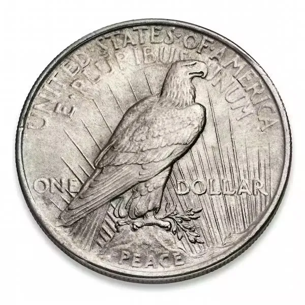 The reverse of the coin shows a perched eagle looking out into rays of sunlight. “UNITED STATES OF AMERICA” and “E. PLURIBUS UNUM” are arched across the top, while the words “ONE DOLLAR” and “PEACE” are toward the bottom of the coin.