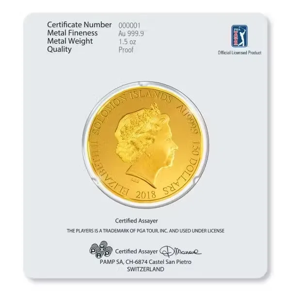 The protective packaging for each coin features the beautiful 17th hole, echoing the design on the coin itself. Shown on the back of each package, which provides a numbered certificate of authenticity, are statements of metal purity and weight, and the signature of the Swiss Assayer Fondeur who assures the quality of the production.